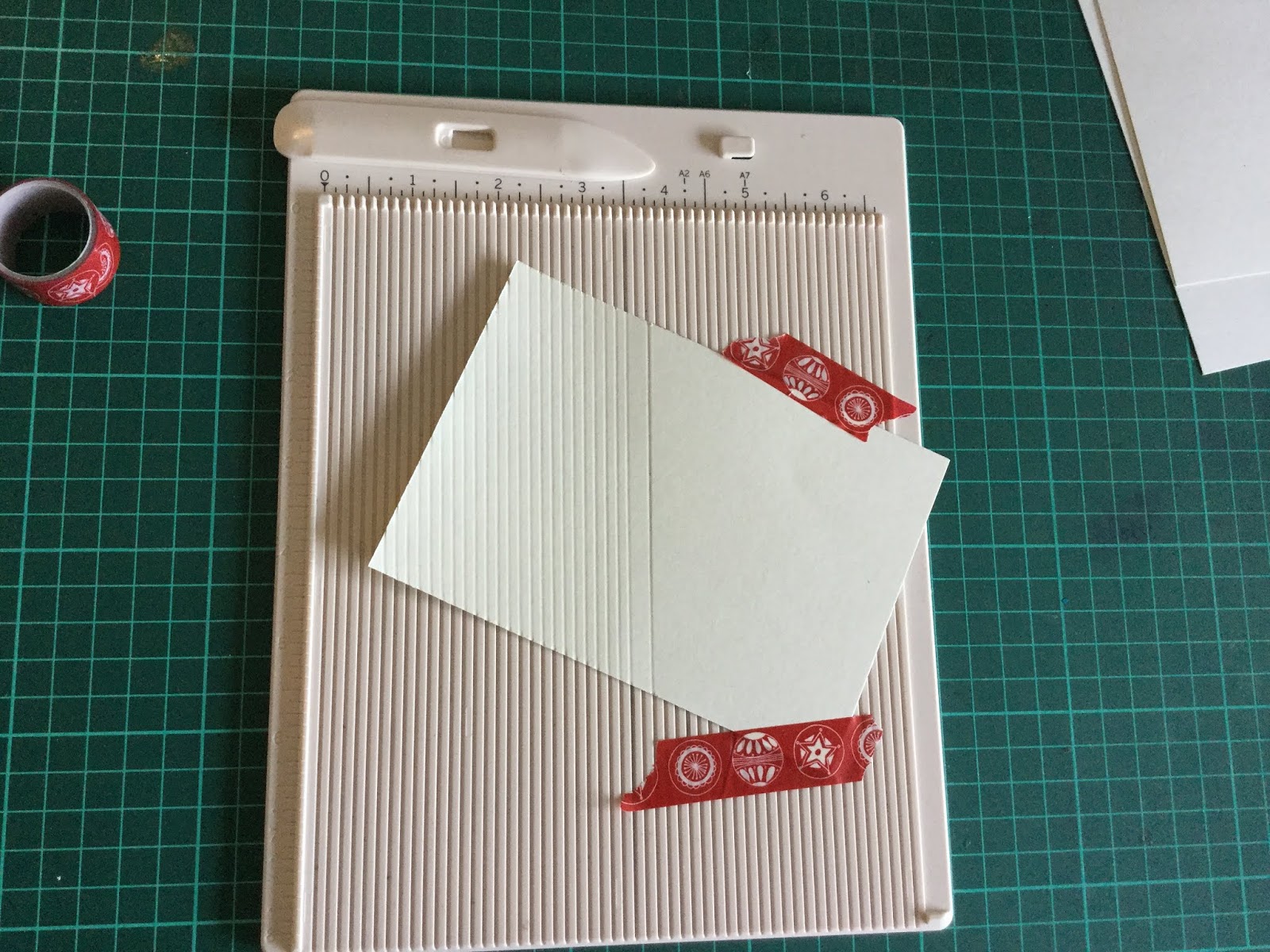 I have used washi tape to make sure the paper in stays in place. Carefully continue to score across the remaining card towards the top, until the top section is all with mountain style score lines.